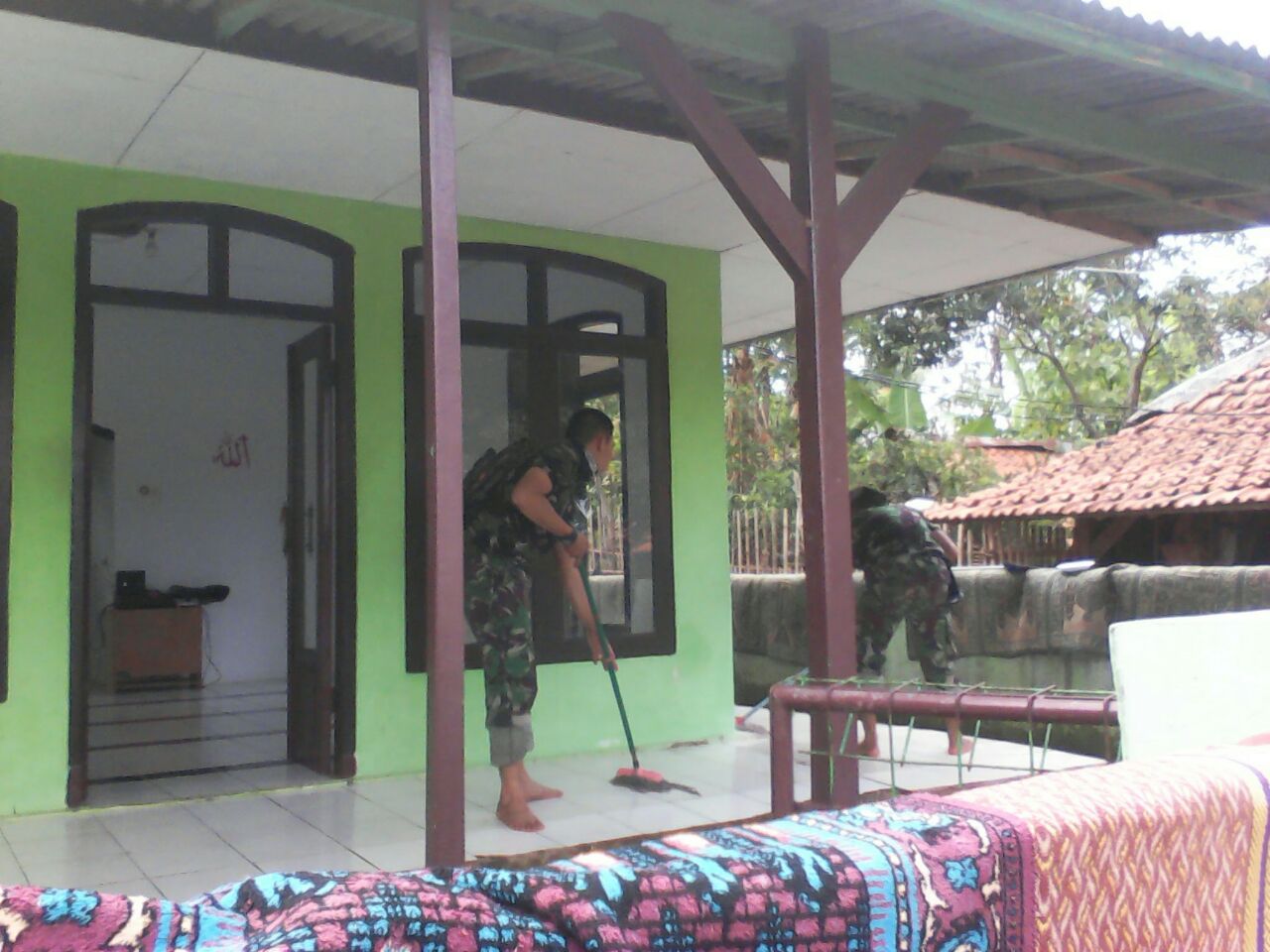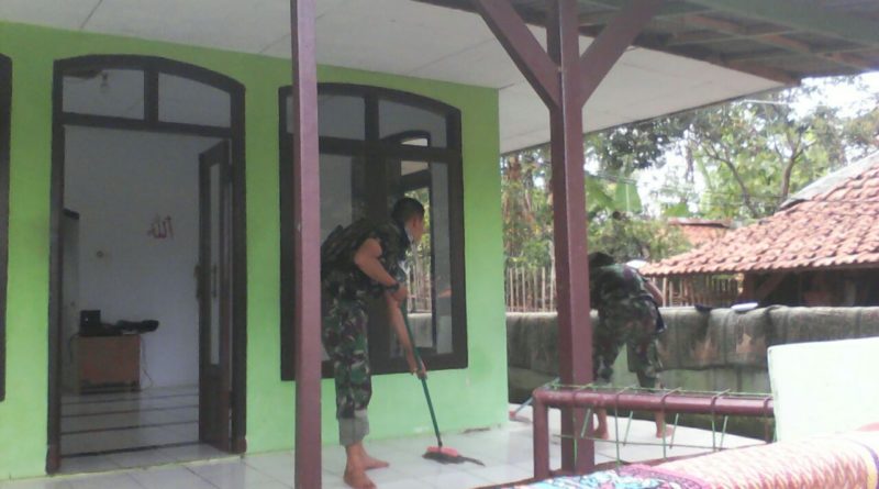 Anggota Satgas TMMD Dibantu Warga Membersihkan Mushola Al Ikhlas di Desa Margaluyu.