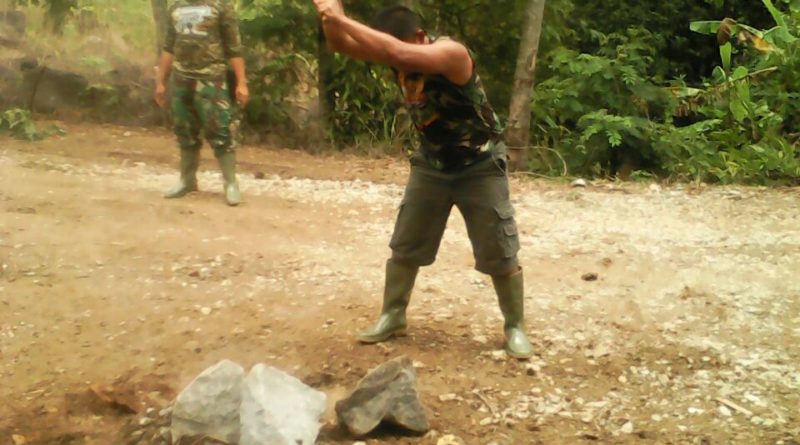 “Batalyon Zipur memang dibekali dengan kemampuan kontruksi, jadi sudah biasa menggunakan palu seperti ini untuk membelah batu”, tutur Pratu…dalam sela istirahat.