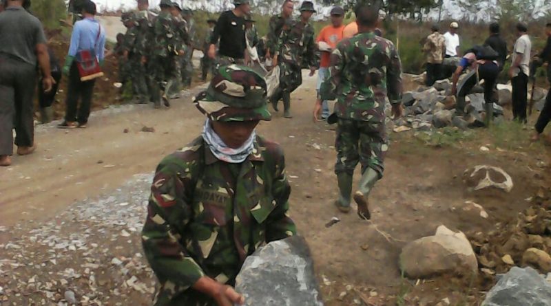 Anggota Satgas bersama warga menggelar batu Beskos.