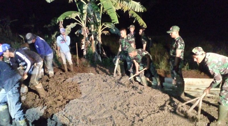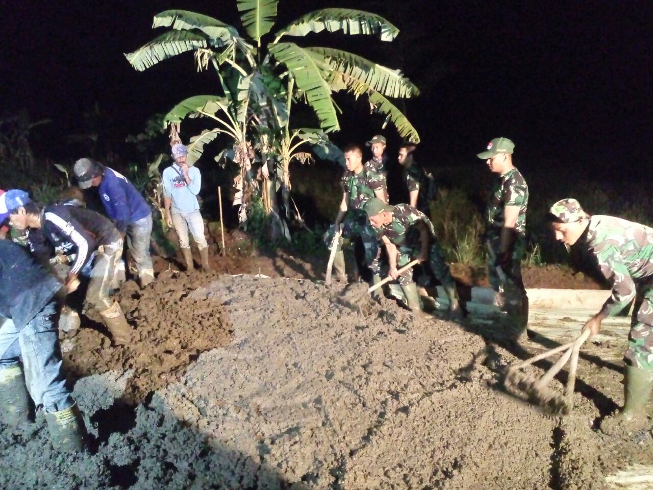 Anggota TNI dan Masyarakat Siang Malam melaksanakan Pengecoran jalan