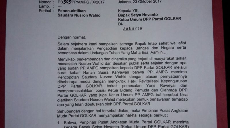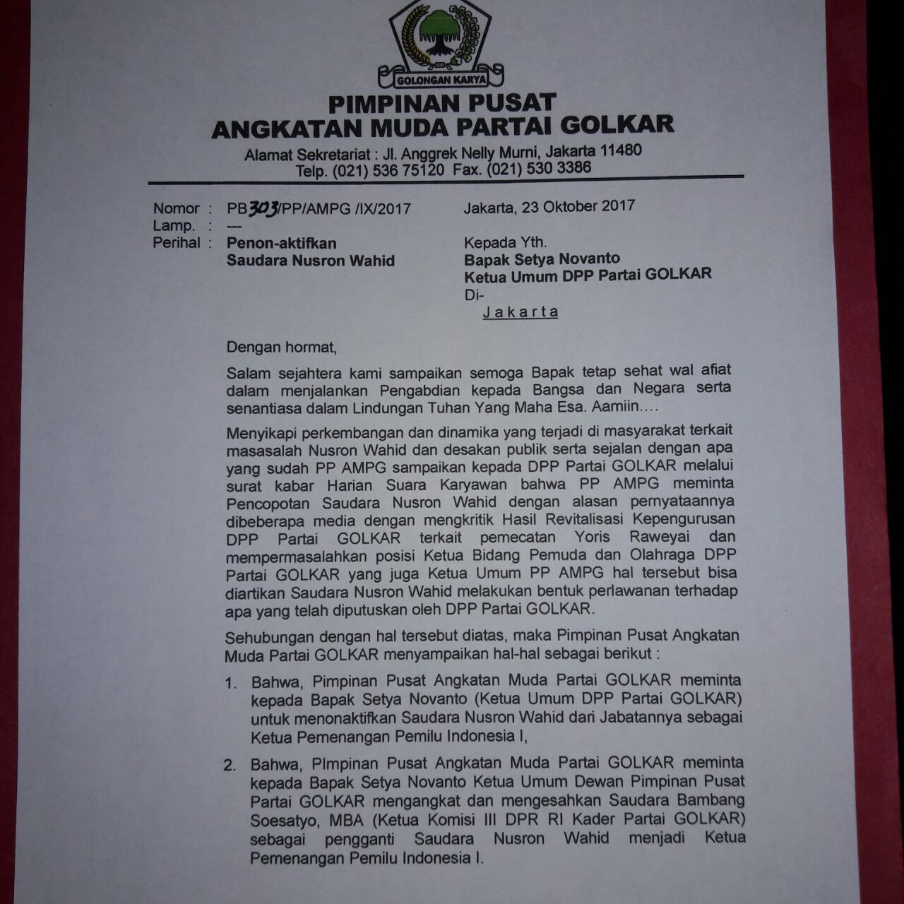 “Bahwa, Pimpinan Pusat Angkatan Muda Partai Golkar meminta kepada Bapak Setya Novanto (Ketua Umum DPP Partai Golkar) untuk menonaktifkan Saudara Nusron Wahid dari jabatannya sebagai Ketua Pemenangan Pemilu Indonesia I,” demikian bunyi surat tersebut.