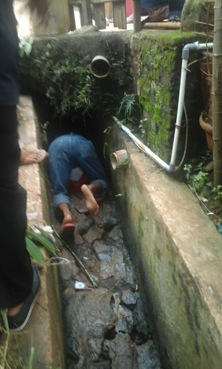 Seorang anak Tujuh tahun terseret arus air selokan hendak mencuci kaki usai bermain bola, diperbatasan antara Kampung Utan RT 06 RW 03 Kelurahan Pondok Jaya Kota Depok dengan Kampung Panjang RT 03 RW 17 Desa Rawa Panjang Kabupaten Bogor.