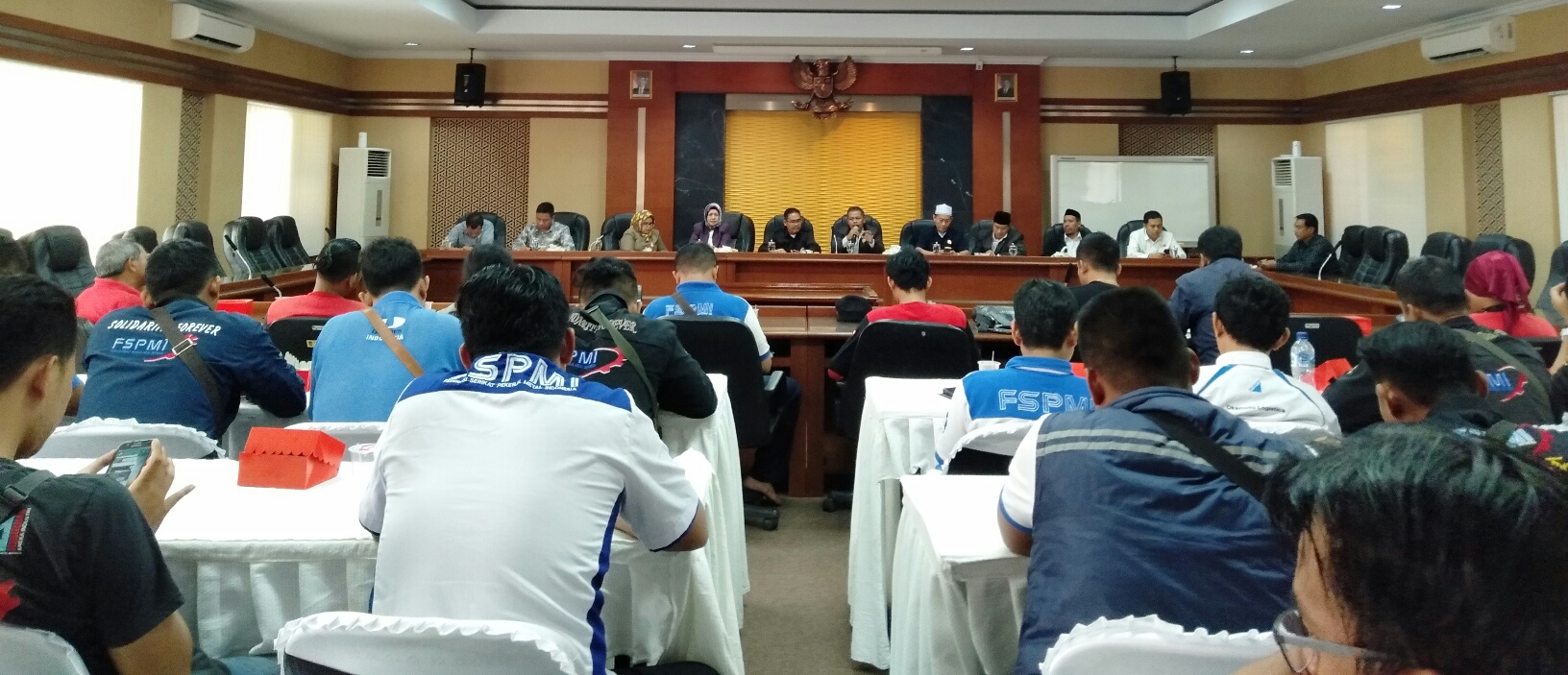 Hadir dalam rapat audiensi itu selain Ketua DPRD Purwakarta sementara, juga pimpinan fraksi PKB, PKS, dan Gerindra, Sekretaris DPRD Drs. H. Suhandi, M.Si, para Kabag, Ketua FSPMI Fuad BM dan segenap jajarannya.