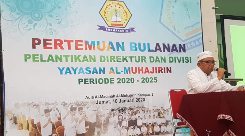 PURWAKARTA – Yayasan Al-Muhajirin Purwakarta gelar pertemuan bulanan sekaligus pelantikan direktur dan divisi yayasan Al-Muhajirin periode Tahun 2020 – 2025, Jum’at , (10/01/2012) di Aula Al-Madinah Kampus 2 Al-Muhajirin Purwakarta