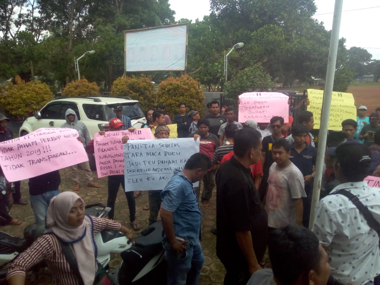 “Kami meminta panitia 11 agar memperlihatkan hasil tes kompetensi balon kades dan landasan hukum atas penilaian itu kalau tak bisa buktikan saya minta panitia 11 di bubarkan,” teriak Nendi didampingi Heni, selaku yang mengoordinir aksi damai yang turut dikawal Polsek Purwasari Kodim, dan Satpol PP.