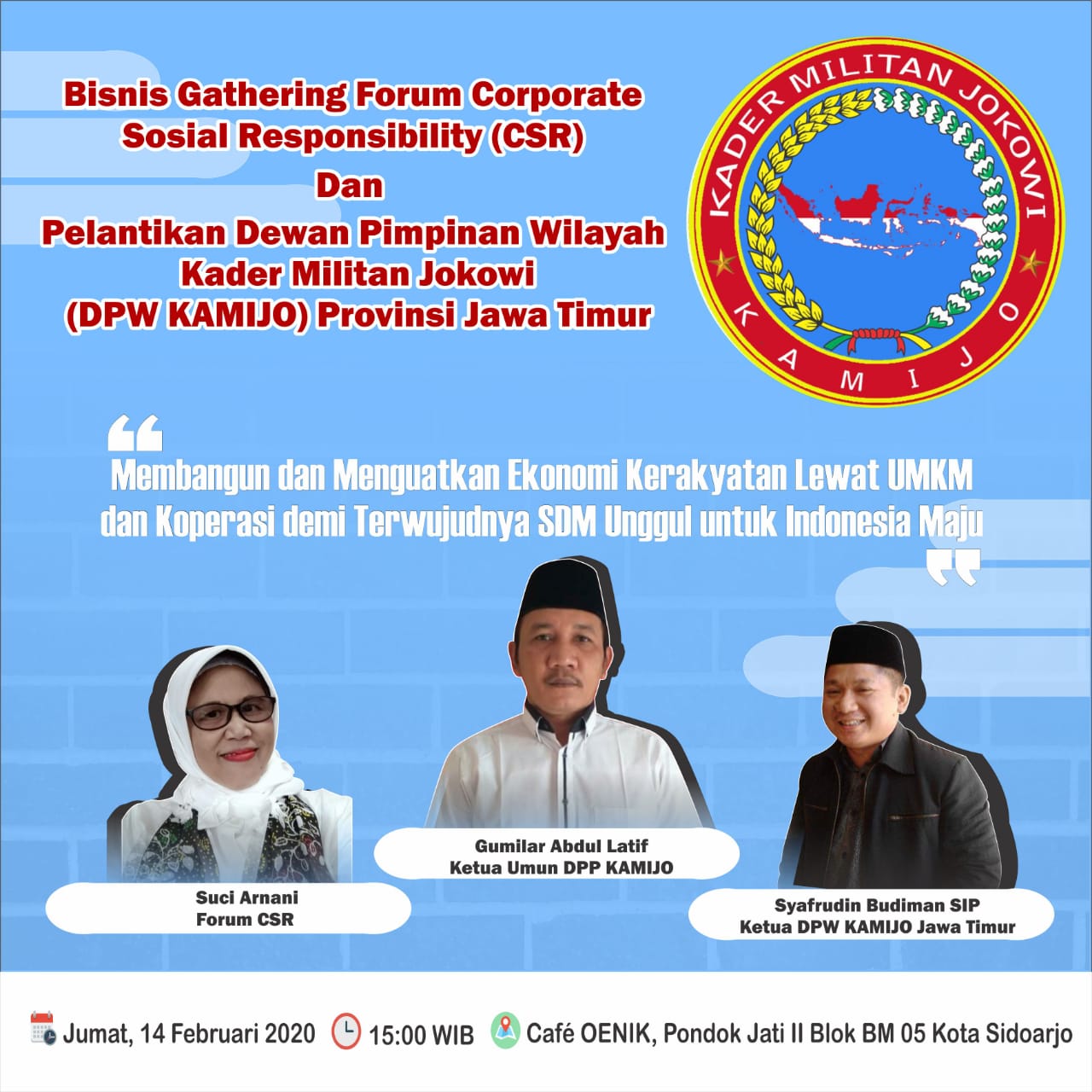 Surabaya – Dewan Pimpinan Wilayah Lembanga Kader Militan Jokowi (DPW KAMIJO) Jawa Timur akan menggelar pelantikan 14 Februari 2020. Acara ini dikemas berbarengan dengan Bisnis Gathering Forum Corporate Sosial Responsibility (CSR).