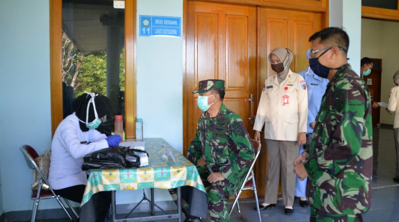 Berita Gambar : Komandan Lanud Suryadarma Marsma TNI I Wayan Sulaba, S.Sos., M. Msc., saat melaksanakan donor darah dalam mengatasi kekurangan pasokan darah saat wabah Covid-19.