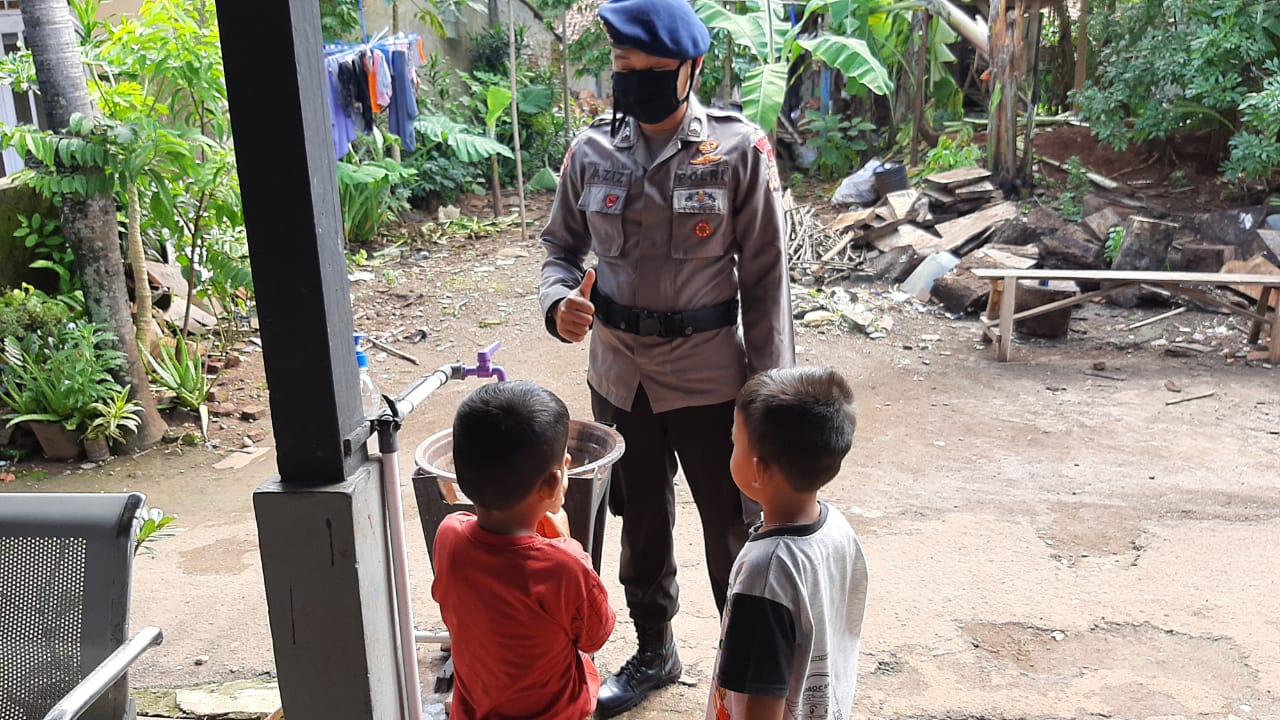 Terpantau dengan humanis Briptu Aziz Muhyidin pun di hadapan anak – anak menyampaikan edukasi tata cara bersihkan tangan, “Adik – adik semua selalu rajin mencuci tangan ya supaya tangan adik – adik semua jauh dari kuman dan penyakit”, ujarnya.