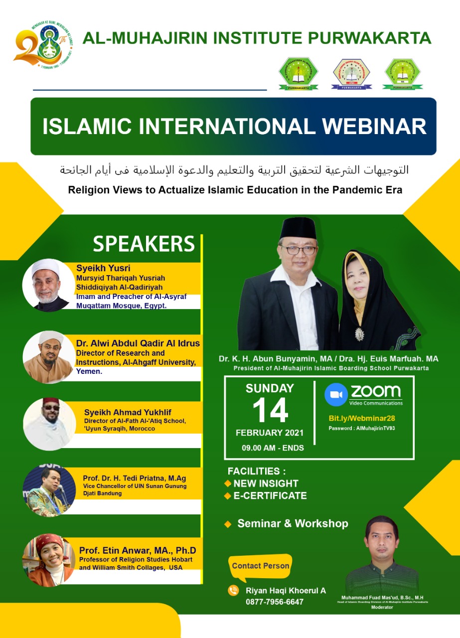 Lebih lanjut Muhammad Fuad Mas’ud, B.Sc., M.H Selain moderator juga Panitia di acara tersebut mengatakan Tema ini diusut sebagai bentuk simpati yayasan Al-Muhajirin terhadap pendidikan Islam di masa pandemi. Webinar diselenggarakan melalui media “zoom meeting” yang diikuti oleh 340 peserta, dengan mendatangkan pembicara luar dan dalam negeri yang berperan dalam menelaah pendidikan, yaitu : Syeikh Yusri (Mursyid Thariqhah Yusriah Shiddiqiyah Al-qadiriyah Imam dan khotib masjid Al-Asyraf Muqattam, Mesir), Dr. Alwi Abdul Qadir Al Idrus (direktur penelitian dan pengajaran Universitas Al-Ahgaff, Yaman), Syeikh Ahmad Yukhlif (kepala sekolah Al-Fath Al-‘Atiq, ‘Uyun Syraqih, Maroko), Prof. Dr. H. Tedi Priatna, M.Ag (wakil rektor UIN Sunan Gunung Djati Bandung), dan Prof. Etin Anwar, MA., Ph.D (profesor studi islam Hobart and William Smith Collages, USA).