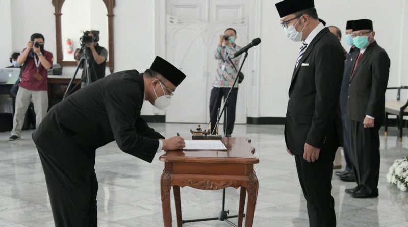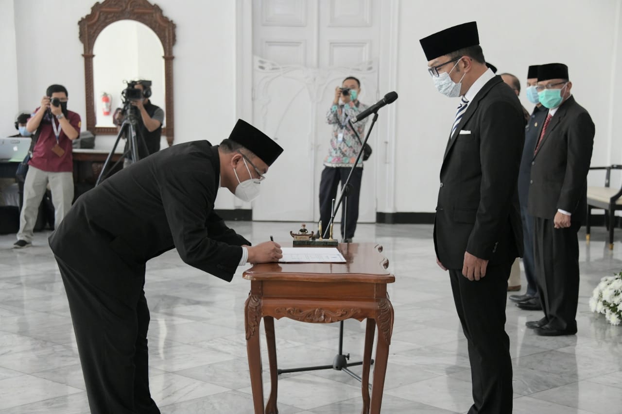KOTA BANDUNG — Gubernur Jawa Barat (Jabar) Ridwan Kamil mengukuhkan Wahidin sebagai Kepala Perwakilan Badan Kependudukan dan Keluarga Berencana Nasional (BKKBN) Provinsi Jabar di Gedung Pakuan, Kota Bandung, Jumat (30/4/2021).