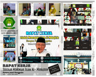 PURWAKARTA – Sekolah Menengah Islam (SMI) Kampus Pusat mengadakan Rapat Kerja Tahun Pelajaran 2021/2022 di Aula Biru SMI 1-3 Al-Muhajirin Kampus Pusat, Kamis (15/07). Rapat Kerja ini dihadiri langsung oleh Pimpinan Pondok Pesantren Al-Muhajirin Purwakarta Dr. KH. Abun Bunyamin, MA., Ketua Yayaasan Al-Muhajirin Dr. Hj. Ifa Faizah Rohmah, M.Pd., Kepala Sekolah SMI 1-3 H. Amit Saepul Malik, M.Pd.I., Kepala Sekolah SMI 4-6 KH. R. Marfu Muhyiddin Ilyas, MA., Pengasuh Asrama Putri Dr. Hj. Zahra Haiza Azmina, M.Ag., dan guru-guru yang tinggal di lingkungan pesantren. Selain itu, diikuti jua oleh guru, staff, dan pegawai via zoom meeting.