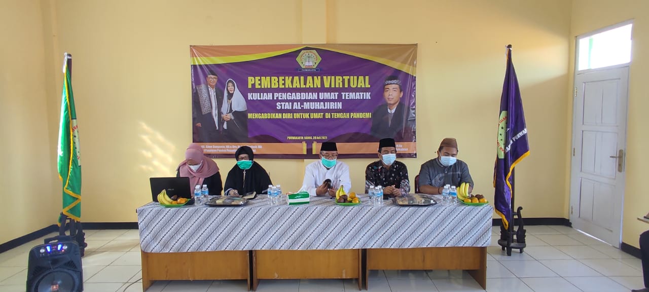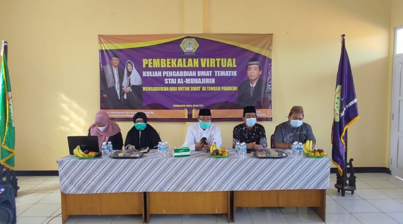PURWAKARTA – STAI Al-Muhajirin Purwakarta gelar embekalan Kuliah Pengabdian Umat (KPU) Tematik secara virtual untuk para peserta KPU yang berjumlah 40 Mahasiswa dengan tema mengabdikan diri untuk umat di tengah pandemi.
