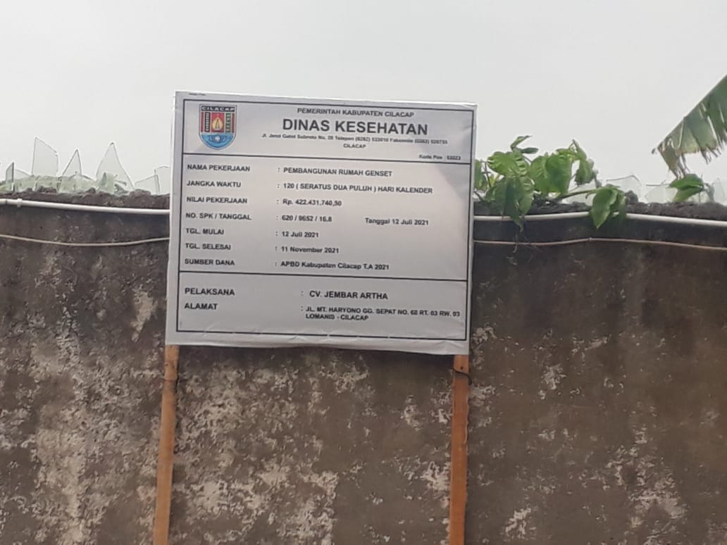 CILACAP – Pembangunan rumah genset diduga menyalahi bestek yang ada pasalnya, saat media ini ke lokasi proyek tersebut yang dikerjakan oleh CV Jembar Artha dengan anggaran Rp. 422.431.740,- yang dianggarkan melalui APBD Kab. Cilacap tahun 2021
