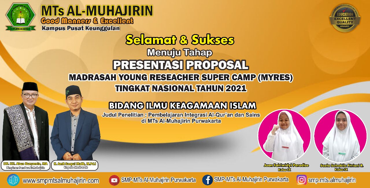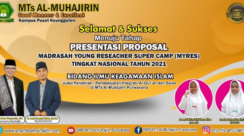 “Kami sangat mengapresiasi kepada anak-anak yang mengikuti lomba MYRES 2021 yang Alhamdulillah proposalnya lulus administrasi untuk tahap presentasi proposal Bidang Ilmu Keagamaan dengan judul penelitian Pembelajaran Intregasi Al-Quran dan Sains di MTs Al-Muhajirin Purwakarta.” Ucap H. Amit