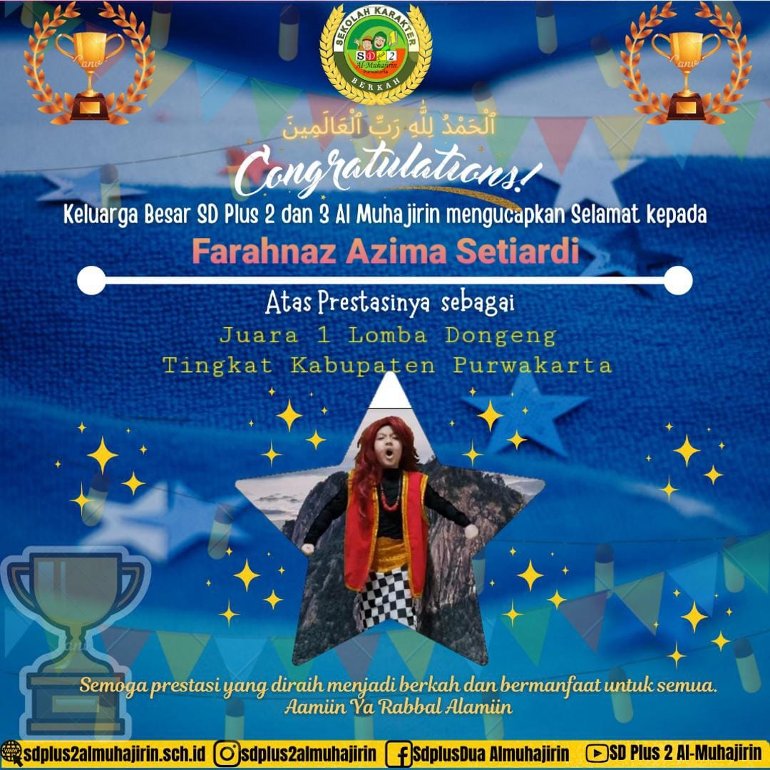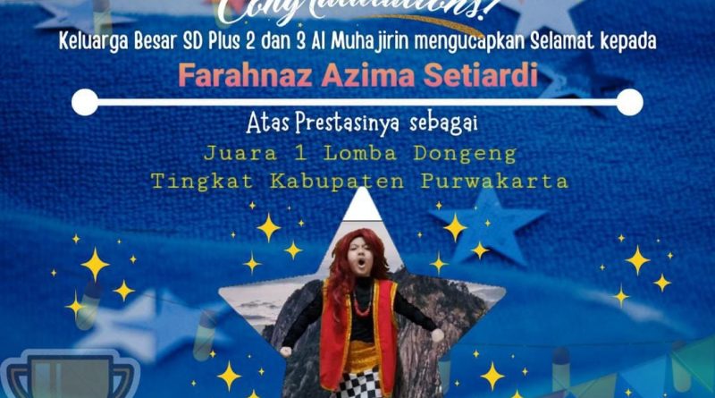 PURWAKARTA – Meski masih dalam suasana pandemic covid-19, Pondok Pesantren Al-Muhajirin tak pernah berhenti untuk meraih prestasi, dan kali ini SD Plus 2 Al-Muhajirin kembali mengharumkan Al-Muhajirin dengan mendapatkan prestasi sebagai Juara 1 Lomba Dongeng Tingkat Kabupaten Purwakarta yang di raih oleh siswa kelas 3 SD Plus 2 Al-Muhajirin Farahnaz Azima Setiardi
