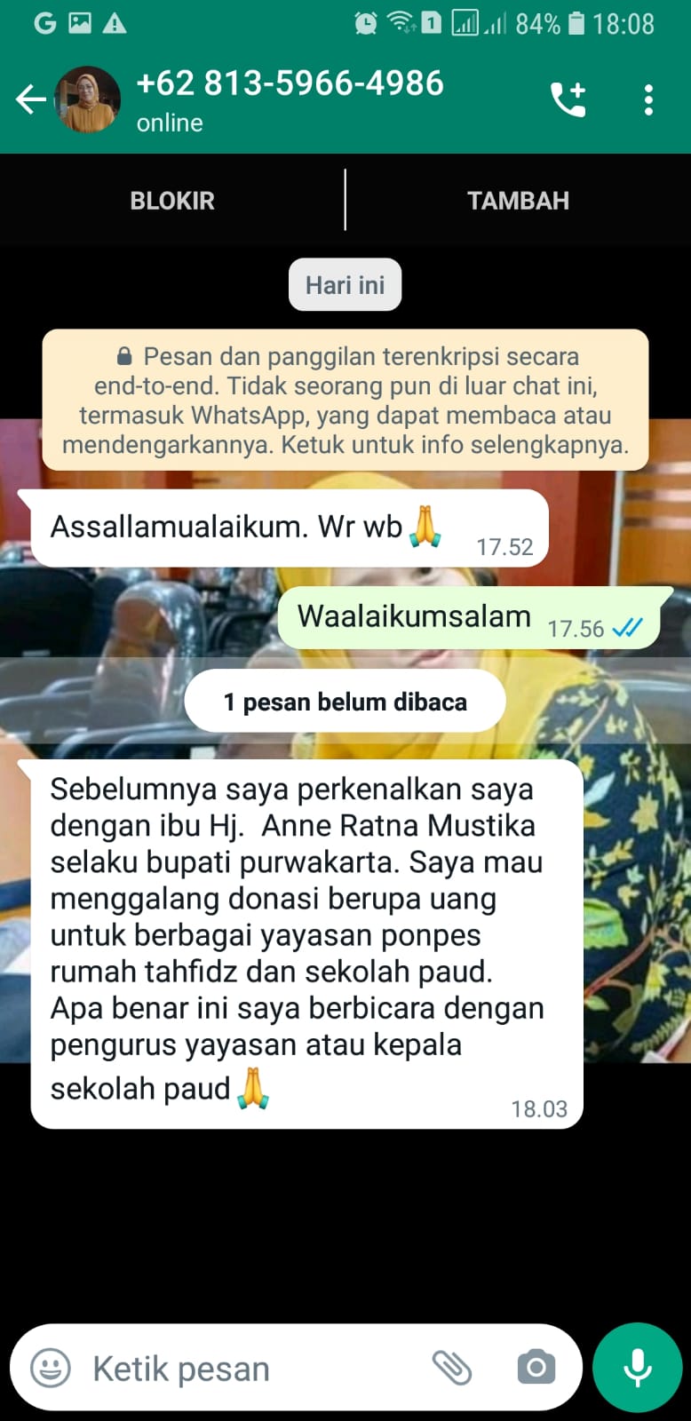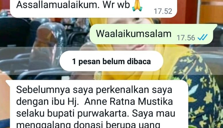 PURWAKARTA – Dengan modus penggalangan donasi untuk yayasan, Ponpes, Rumah Tahfidz dan PAUD. Oknum ditenggarai melakukan upaya penipuan dengan mengatasnamakan orang nomor satu di Purwakarta melalui pesan elektronik jejaring Whatsaap.