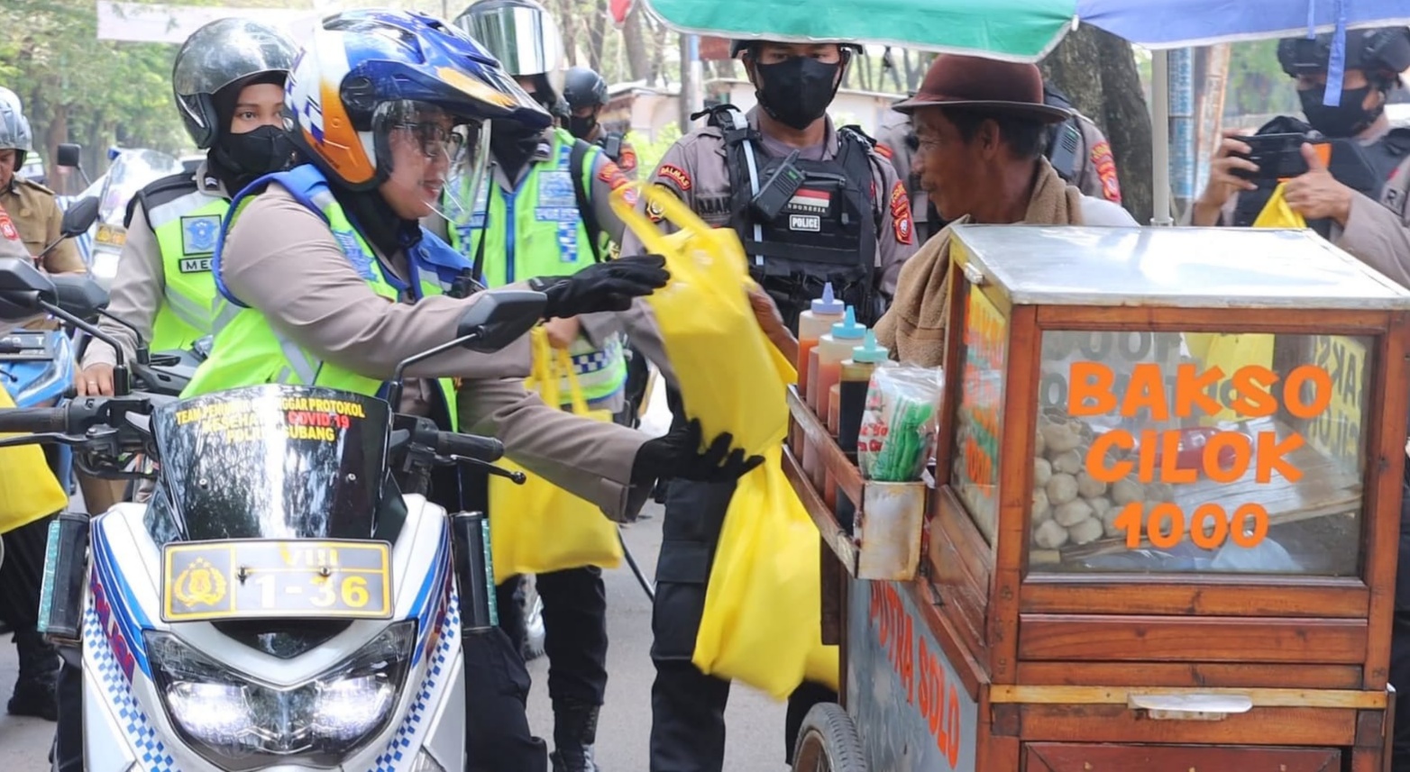 “Kegiatan patroli ini kami bersama jajaran Polres Subang memberikan bantuan sembako juga kepada para pedagang di sepanjang jalan, dan tentunya sebagai bentuk kepedulian kami dari Polri khususnya Polres Subang, terhadap masyarakat yang memang membutuhkan,” ujar AKBP. Sumarni.