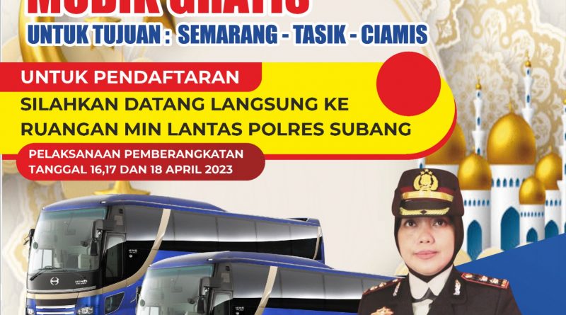 “Bagi warga yang ingin mengikuti Program Mudik Gratis Polres Subang hanya cukup mendaftar datang langsung ke ruang Min Lantas Polres Subang, atau info lebih lanjut dapat melalui Via Tlp No 081916943118, selama kouta-nya masih ada, kami terus membuka pendaftaran,” ucapnya