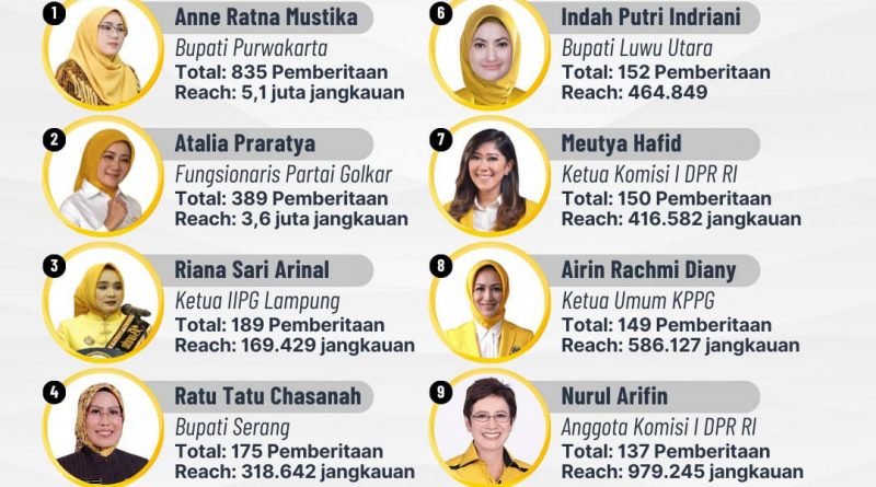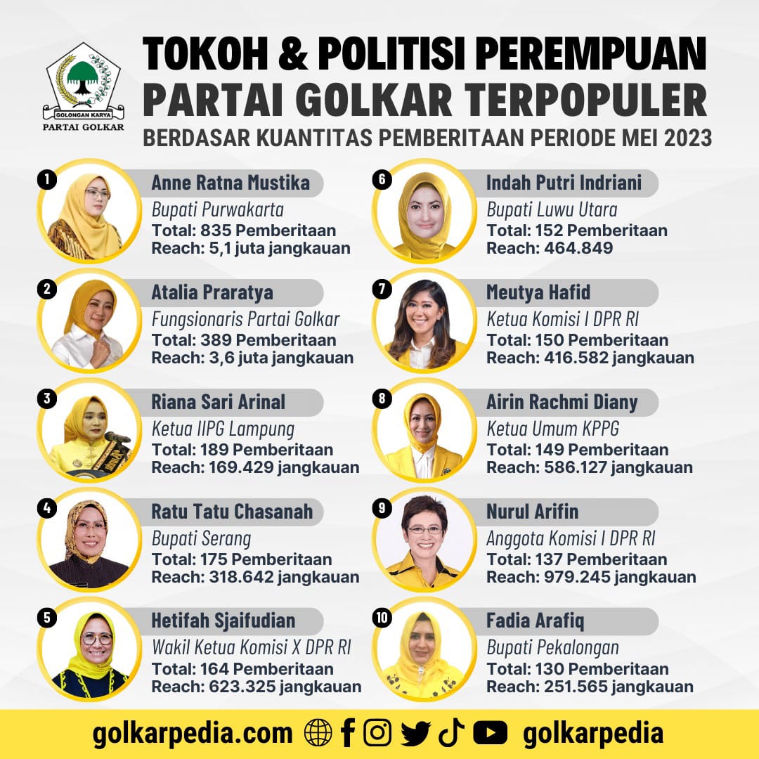 PURWAKARTA, jabarexposeraya.com – Bupati Purwakarta Anne Ratna Mustika tetap kembali terpilih menjadi politisi perempuan Partai Golongan Karya (Golkar) paling populer versi Golkarpedia untuk perode Mei 2023.