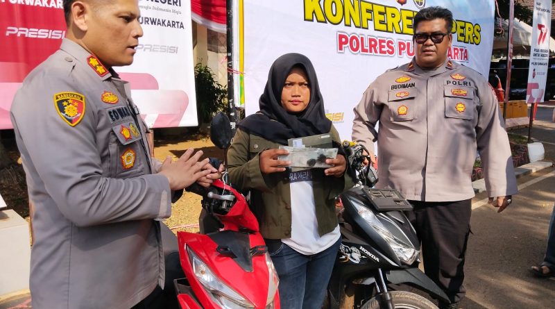 PURWAKARTA, jabarexposeraya.com – Perasaan sumringah terpancar dari raut wajah Sulastri warga Desa Bunder, Kecamatan Jatiluhur, Kabupaten Purwakarta. Pasalnya motor milik wanita yang berprofesi sebagai tukang ojek motor yang sempat digondol maling, kembali ditemukan.