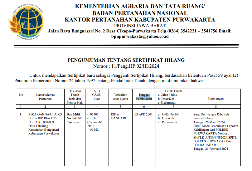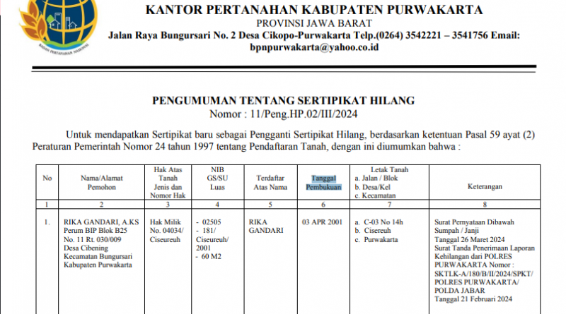 PURWAKARTA – Telah hilang Sertifikat Tanah atas nama RIKA GANDARI, A.KS,
