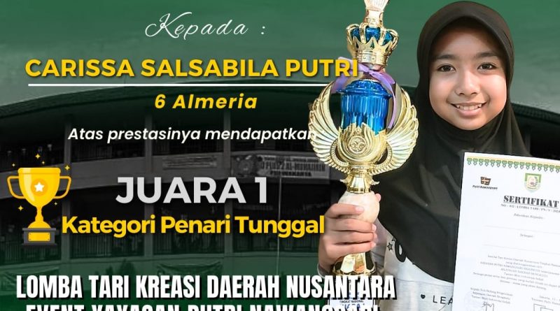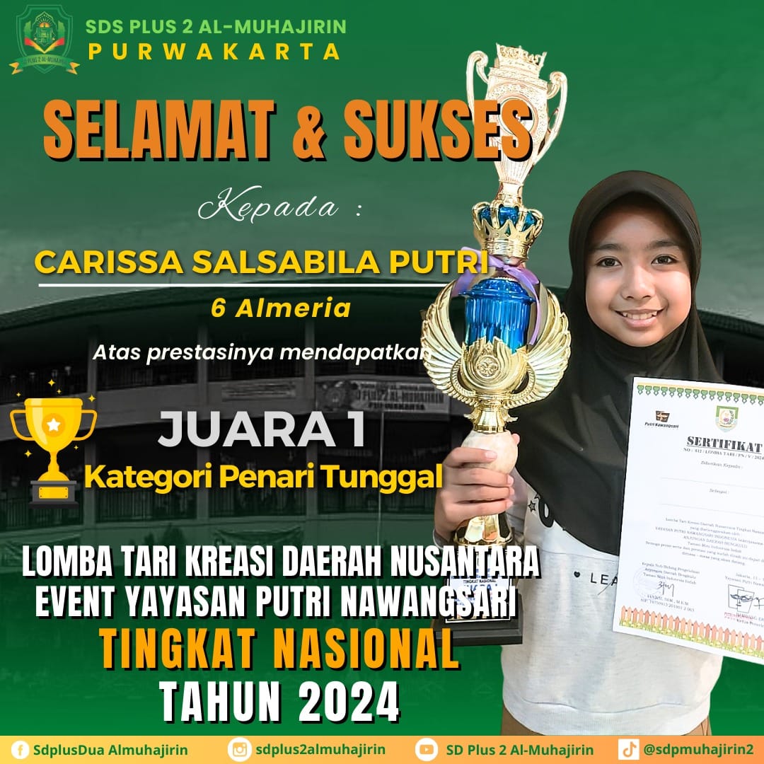 Kali ini Santri Al-Muhajirin, tepatnya, santri Kelas 6 Almeria SD Plus 2 Al Muhajirin Kampus 2, Carissa Salsabila Putri,meraih prestasi yang membanggakan di tingkat nasional yaitu sebagai Juara 1 di ajang lomba tari kreasi daerah nusantara event Yayasan Putri Nawangsari Tingkat Nasional Tahun 2024. Kategori Penari Tunggal.