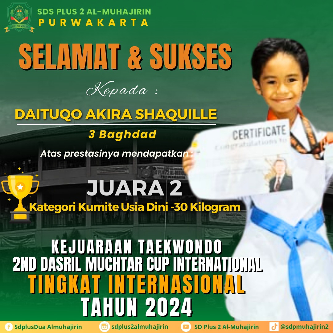 PURWAKARTA – Prestasi membanggakan kembali ditorehkan oleh Santri Al Muhajirin, atlet muda taekwondo asal Purwakarta. Daituqo Akira Shaquille, anak berusia 9 tahun ini, berhasil meraih juara 2 pada Kejuaraan Taekwondo 2nd Dasril Muchtar Cup International Tingkat Internasional Tahun 2024 yang diselenggarakan di Baghdad, Irak.