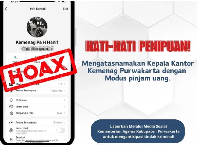 PURWAKARTA, jabarexposeraya.com – Masyarakat diminta waspada aksi penipuan mengatasnamakan Kepala Kementerian Agama (Kemeneg) Purwakarta H. Hanif Hanfi yang dilakukan pihak tidak bertanggung jawab.
