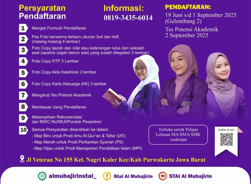 Purwakarta, JER – Sekolah Tinggi Agama Islam (STAI) Al-Muhajirin Purwakarta membuka program Beasiswa Peduli Umat 2025, memberikan kesempatan emas bagi lulusan MA/SMA/SMK sederajat untuk kuliah secara gratis. Beasiswa ini mencakup bebas biaya pembangunan dan SPP per semester, sehingga mahasiswa dapat fokus menimba ilmu tanpa beban biaya kuliah.