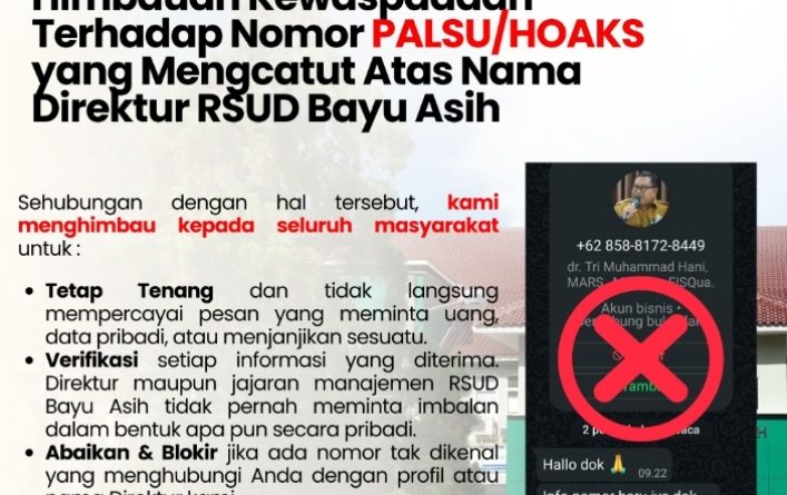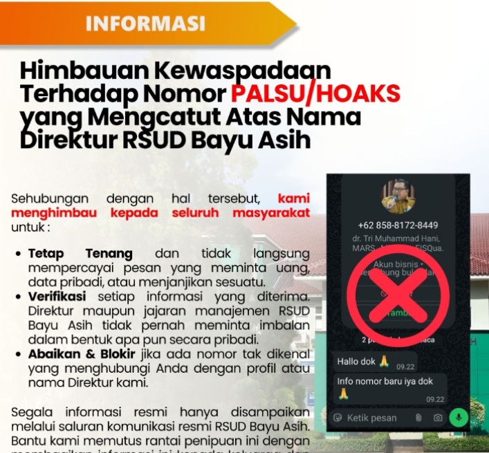 Selain itu, masyarakat juga diimbau untuk melakukan verifikasi terhadap setiap informasi yang diterima yang mencatut nama Direktur maupun manajemen RSUD Bayu Asih.